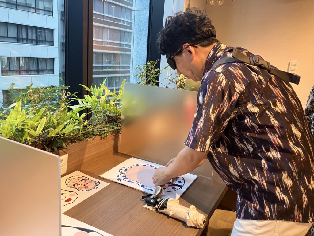 新井氏も、入り口で福笑いを堪能!準備万端です(^^)